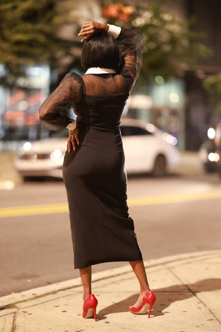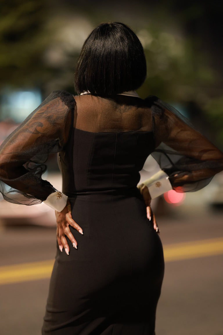 Step into authority and allure with Midnight Command. This sleek black dress with sheer puff sleeves and striking gold buttons embodies refined power. The high slit adds just the right amount of edge, creating a silhouette that commands attention whether it’s a night out or a high-profile event.